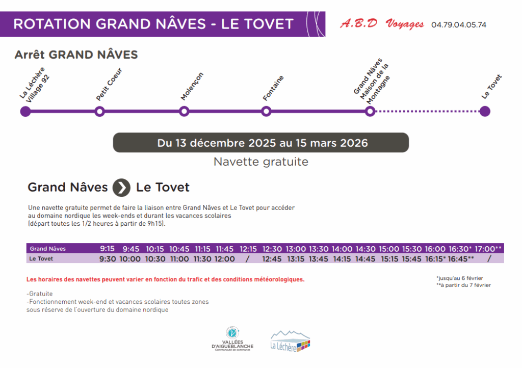 Le voyage commence dès la navette. Pas de volant, pas de stress, on oublie le parking et on savoure le paysage. Empruntez le bus GRATUIT qui part de La Léchère et dessert tous les villages en montant. Terminus devant la Maison de la Montagne. En circulation les week-end et les vacances scolaires.