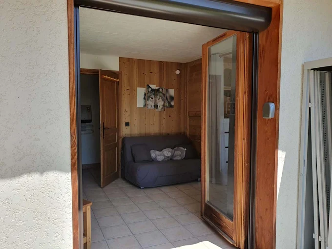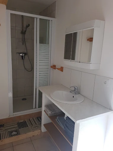 L’appartement, d’une superficie de 32 m², est situé en rez-de-chaussée de la maison des propriétaires et dispose d’une entrée indépendante par le terrain. De plain-pied, il comprend un séjour avec coin cuisine et espace salon (avec BZ convertible), une chambre séparée par un rideau (1 lit double 160×200 cm et 1 lit superposé simple 80×200 cm), une salle d’eau avec douche et WC. Vous profiterez également d’un terrain et d’une terrasse privatifs, ainsi que d’un stationnement sur la propriété.